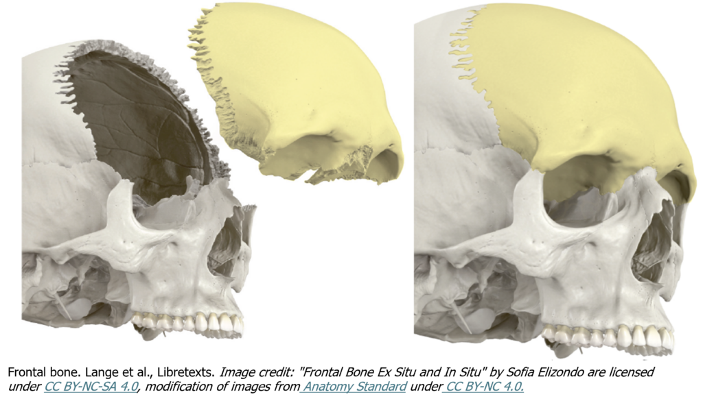 Explore the 8 cranial bones and 14 facial bones summarized in the figure one by one using the dropdowns below. Each dropdown includes a summary of the bone’s location, features, and functions, along with rotating skulls and links to interactive 3D tools to help you visualize its structure, connections and relative position.