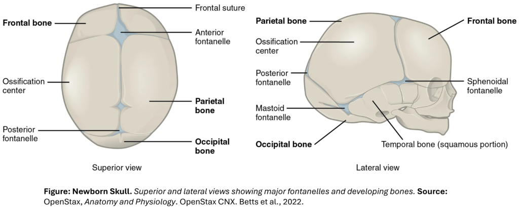At birth, the skull is not fully ossified. The fontanelles—flexible regions of fibrous connective tissue—allow for distortion during birth and accommodate rapid brain growth.