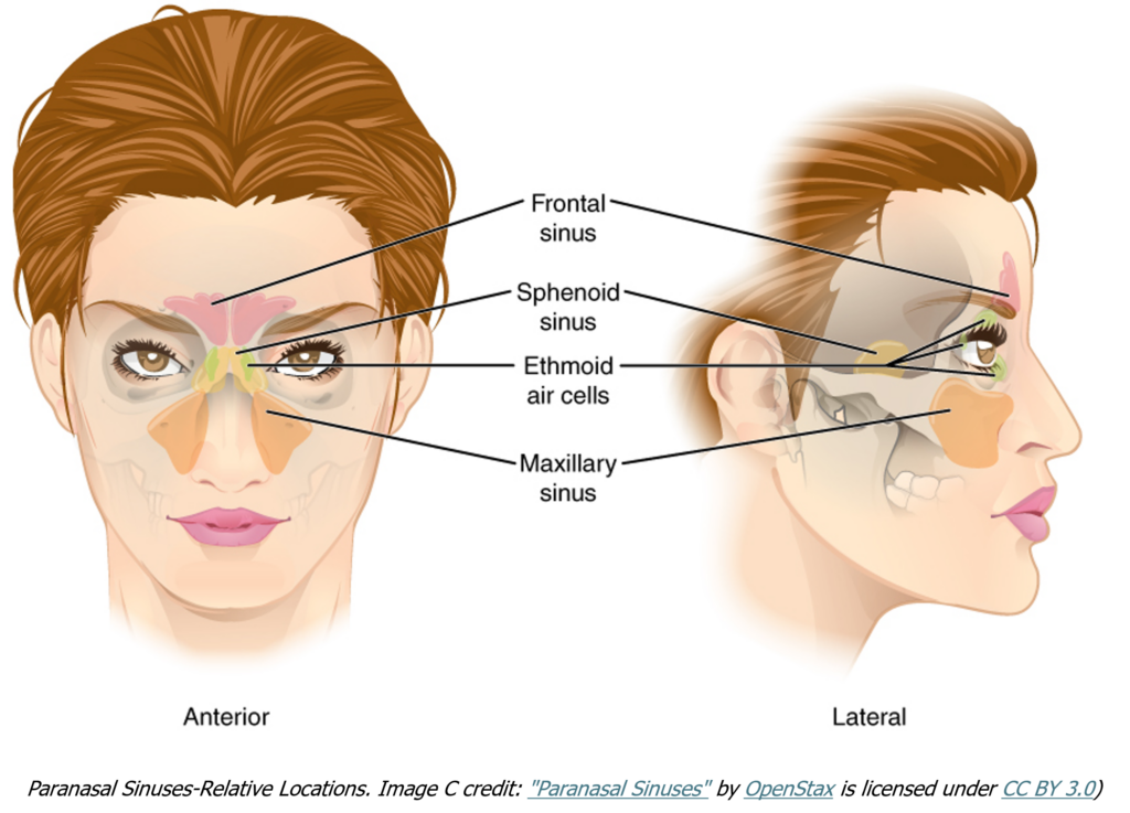 The paranasal sinuses are hollow, air-filled spaces located within specific bones of the skull (Lange et al., 2025; Betts et al., 2022). Each sinus is named for the bone it occupies—paranasal literally means “next to the nasal cavity.”